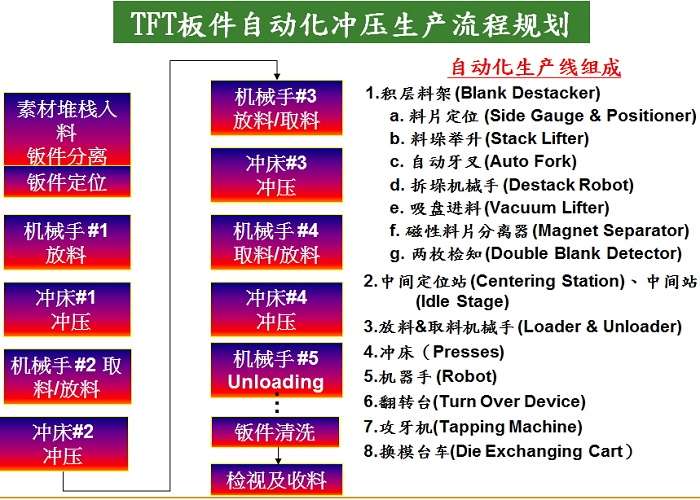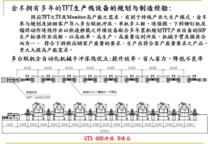 金豐于2001年參與國內第一條TFT產業110 TON ×6連臺配合機械手臂生產,為同業最先最早自動化生產系統。