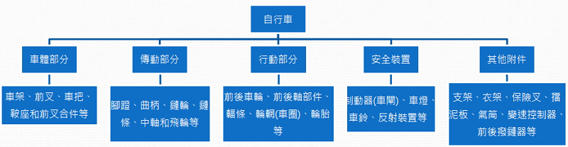自行車的車架、輪胎、腳踏、剎車、鏈條等25個部件中,其基本部件缺一不可。